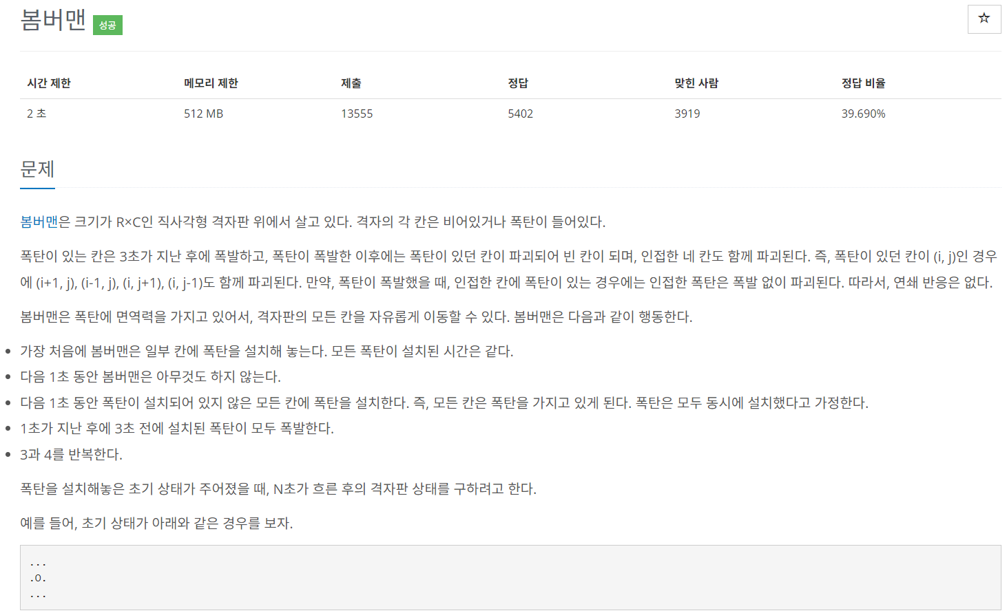 폭탄은 상하좌우로 폭발하기 때문에 폭발시킬 때 BFS 탐색을 수행하면 된다. 만약 1초가 지난 후의 상태를 확인하는 것이라면 아무 일도 일어나지 않은 상태이므로 입력받은 상태 그대로 출력하면 된다.